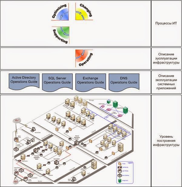 Для многих продуктов компании Microsoft разработаны документы «Operating Guide», которые описывают продукты именно с точки зрения организации их эксплуатации. Итоговая картина передового опыта, собранного годами и даже десятилетиями мировой эксплуатации, сводится к единой стратегической картине, и в представлении Microsoft выглядит следующим образом.